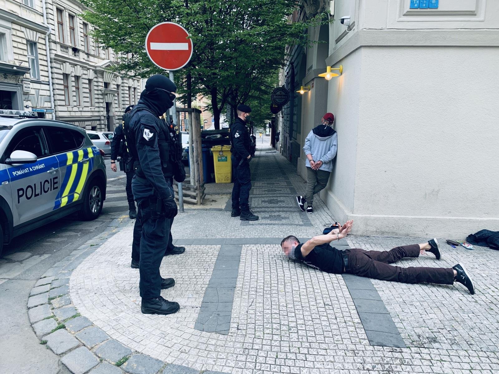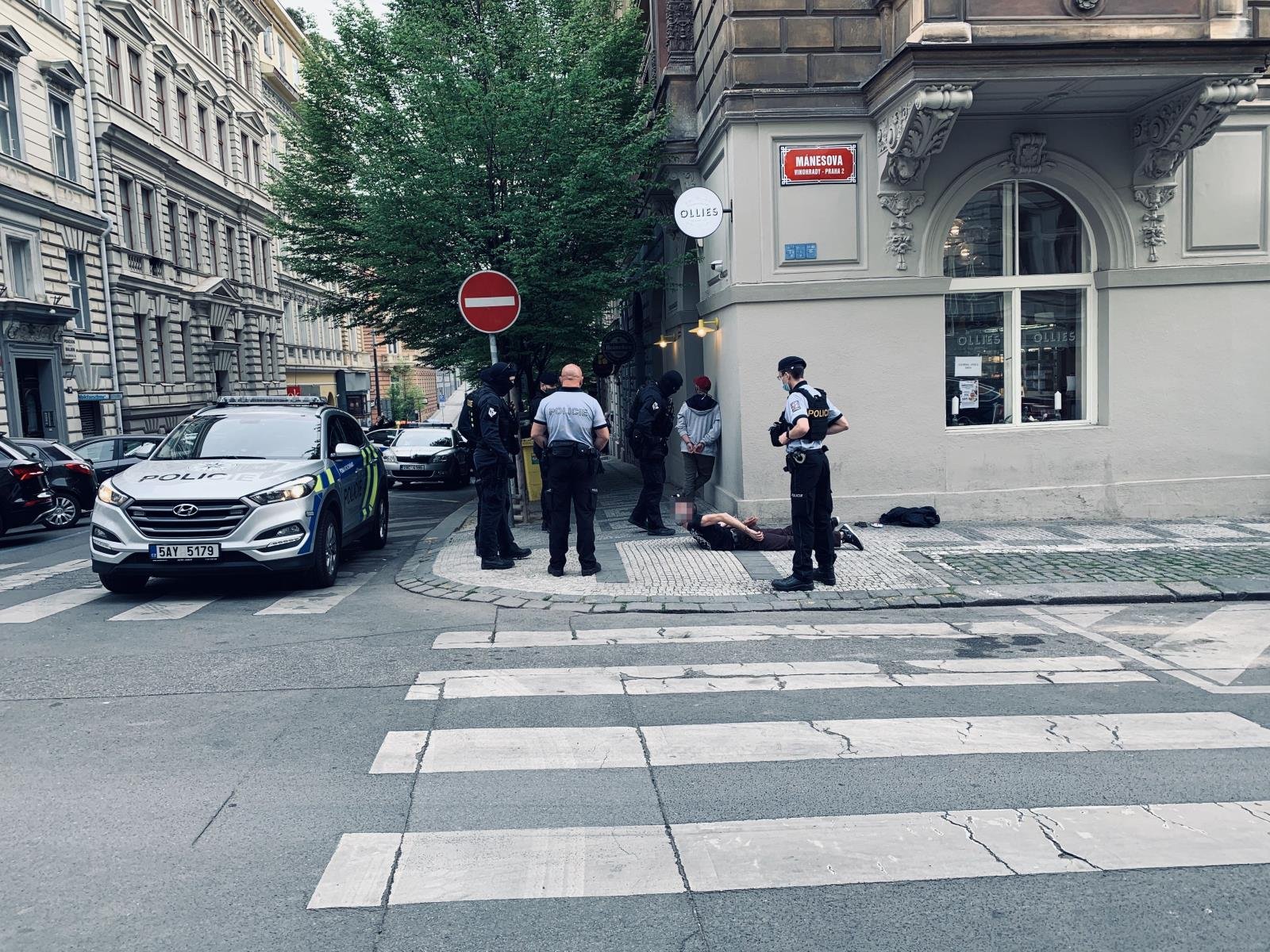 Když policisté přijeli na místo, přišel k nim zakrvácený muž, který jim sdělil popis podezřelých. Jeden z policistů čtyřiačtyřicetiletého poškozeného ošetřil a zavolal mu záchranku. Další dva se vydali pátrat po podezřelých, které nalezli na rohu ulic Balbínova a Mánesova. Oba muže „Péjáci“ zadrželi a spoutali. Vzhledem k tomu, že jeden z nich odmítal s policisty spolupracovat, byly ze strany policistů využity donucovací prostředky. Dvaatřicetiletý zadržený se neuklidnil ani poté, co ho policisté usadili do služebního vozidla, které se snažil kopy a údery hlavou zdemolovat. U mužů policisté nalezli uloupené věci, které měl poškozený v batohu.