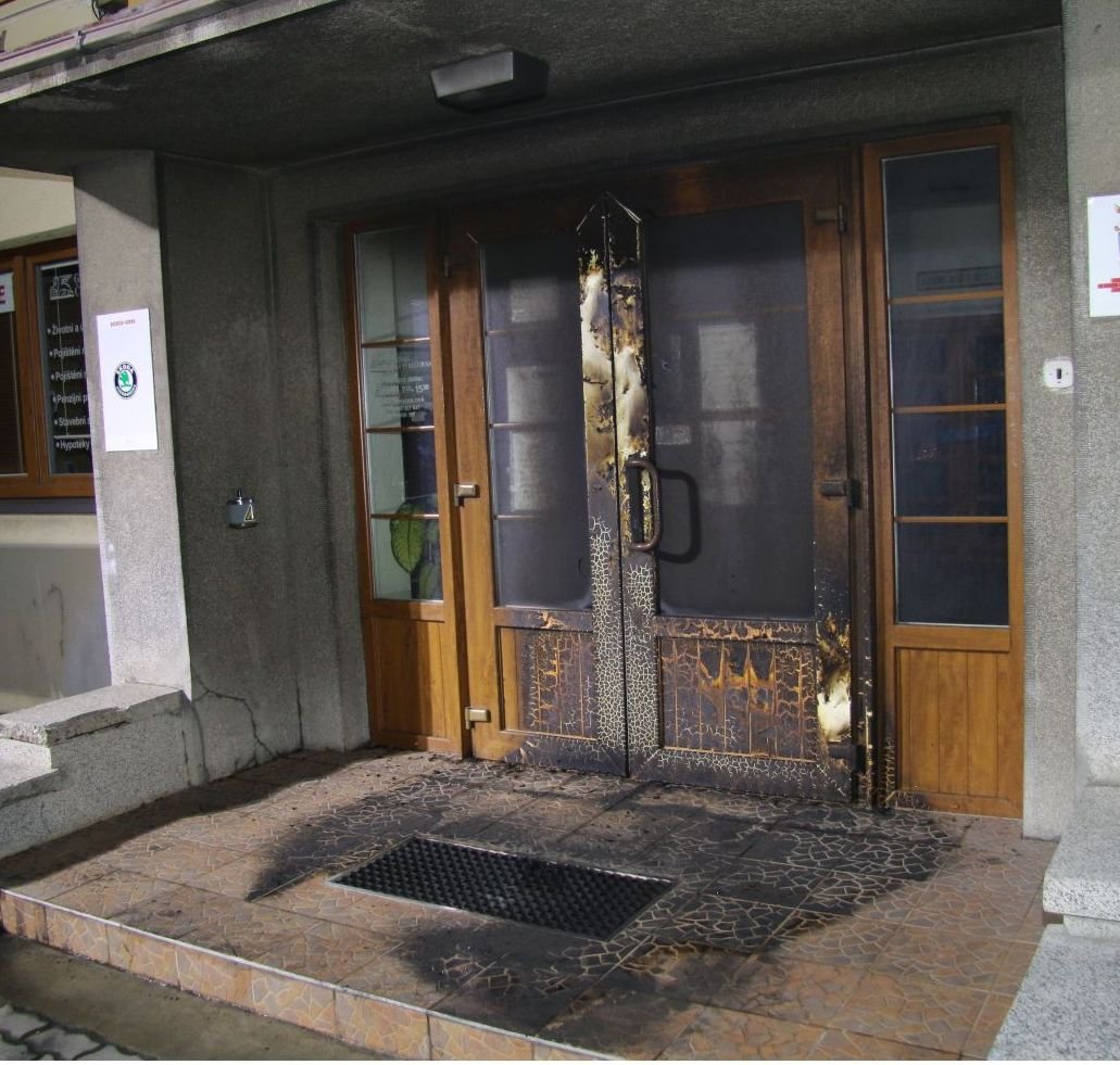 Neznámý pachatel tady v pátek kolem třiadvacáté hodiny zapálil vstupní dveře objektu, na nichž vznikla důsledkem ohoření škoda v předběžné výši asi padesát tisíc korun. Požáru si všiml muž projíždějící kolem a přivolal hasiče, kteří objekt záhy uhasili. Vyšetřovatel policistům potvrdil, že někdo zapálil dveře úmyslně.